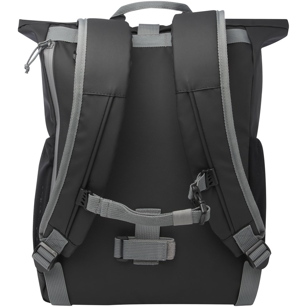 Waterbestendige fietstas met opgerolde bovenkant gemaakt van GRS-gecertificeerde gerecyclede materialen. De tas heeft een gewatteerd 15'' laptopcompartiment, meerdere opbergvakken, verstelbare klittenbandsluiting voor eenvoudige montage op verschillende fietsen en reflecterende biezen voor zichtbaarheid. De gerecyclede GRS-materialen omvatten de hoofdstof, voering, banden en ritsen. Capaciteit: 20 liter. PVC-vrij.