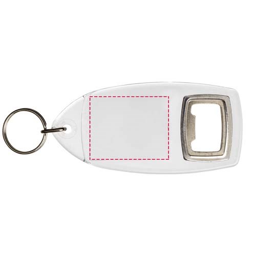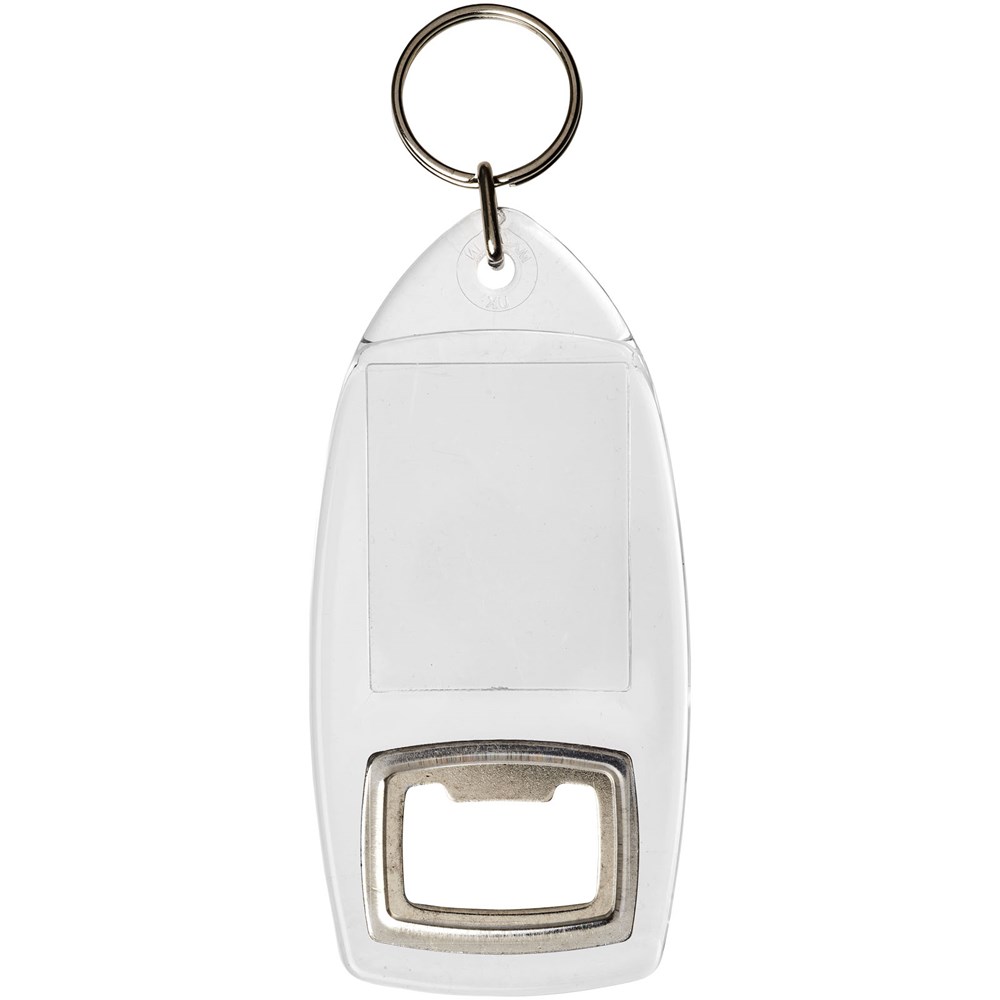 Doorzichtige R1 sleutelhanger met flesopener en metalen sleutelring. De metalen lusring biedt een vlak profiel dat ideaal is voor de post. Afmetingen van het te bedrukken inzetstuk: 4,0 cm x 3,2 cm.
