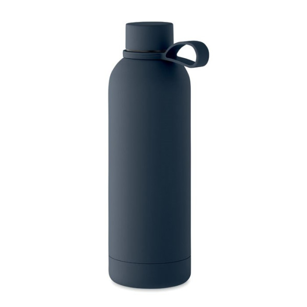 Dubbelwandige vacuüm isolerende fles van gerecycled roestvrij staal (90% gerecycled roestvrij staal en 10% roestvrij staal) met rubberen afwerking en siliconen handvat. Lekvrij. Inhoud: 500ml.