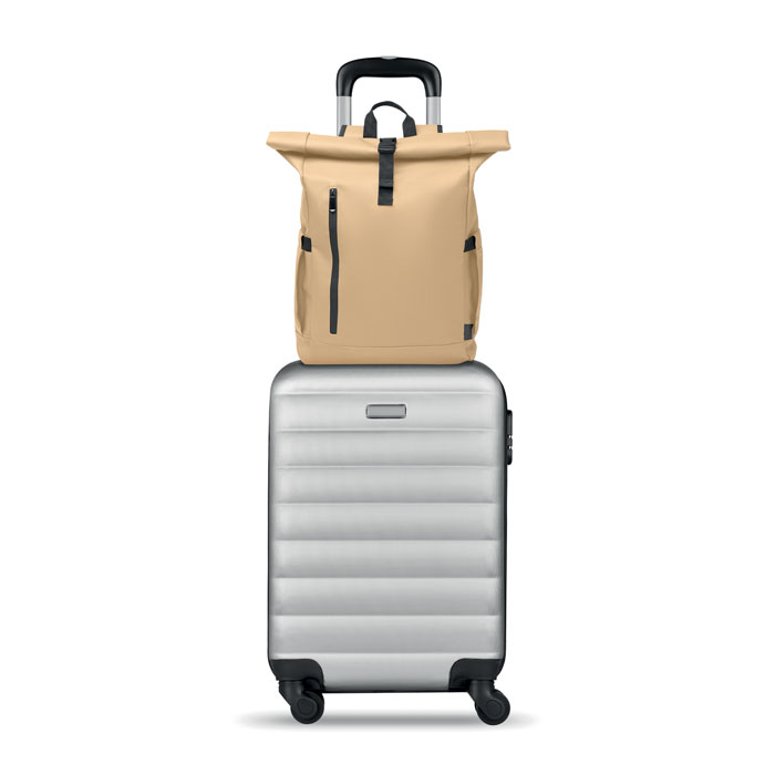 Rolltop 15 inch laptoprugzak van PU-gecoat 600D RPET polyester en RPET polyester voering. Gevoerde mesh-rugzak met ritsvak en trolley riem. Gevoerde schouderband met mesh-afwerking aan de binnenkant.