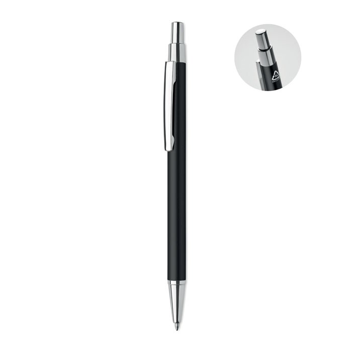 Balpen met drukknop in gerecycled aluminium. Blauwe inkt.meer