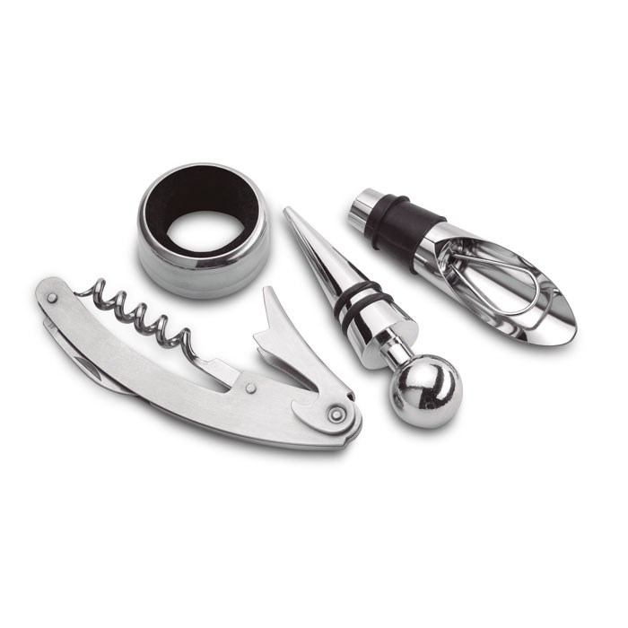 4-Delige wijnaccessoires-set bestaande uit een flessenopener, stop, schenktuit en wijnring. Gepresenteerd in een blikken doosje.