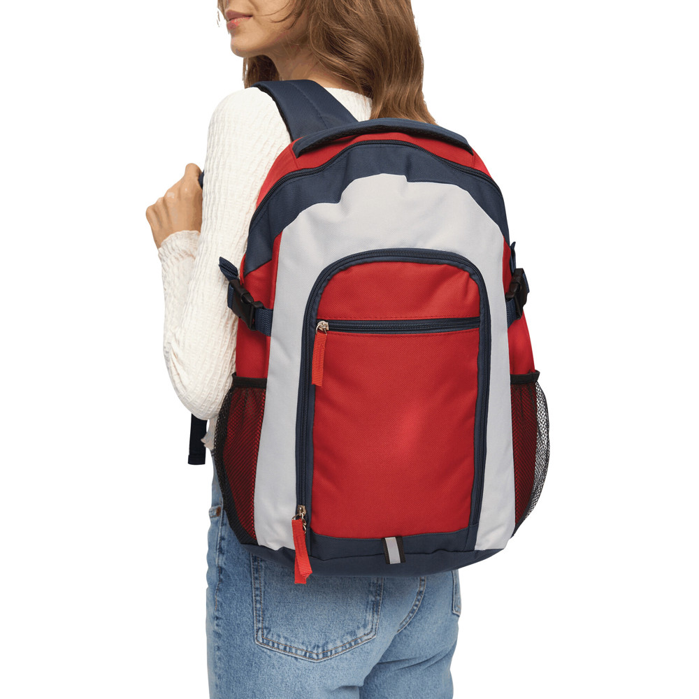 Rugzak MARINA van 600D polyester met gevoerde schouderbanden, handvat en diverse afsluitbare vakken.