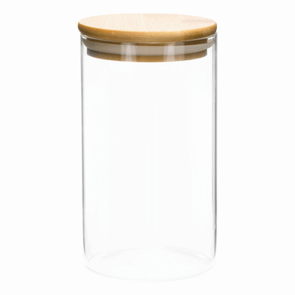Glazen voorraadpot ECO STORAGE M met bamboe deksel voorzien van een siliconen sluitring. Voorraadpotten voor b.v. pasta, muesli, kruiden enz., inhoud ca. 700 ml.