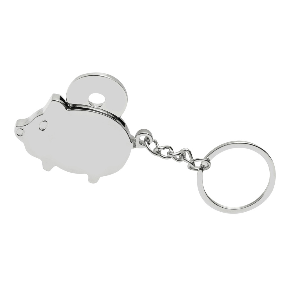Speelse metalen sleutelhanger CHAMBA in de vorm van een spaarvarken met winkelwagenmuntje.meer