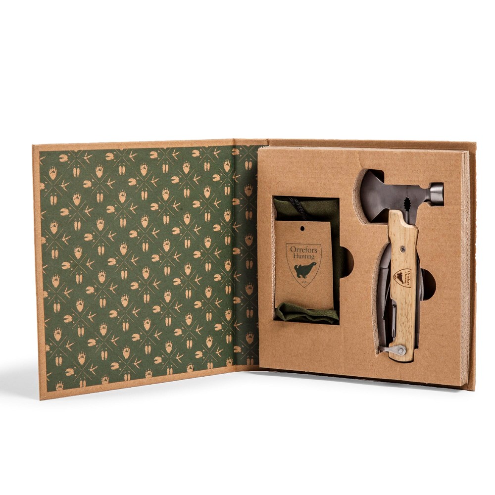 Een handige multitool, ontworpen voor onderweg, zowel binnen als buiten. Bevat tangen en tangen, hamer, kleine bijl, messen, nagelvijlen, schroevendraaiers (platte kop) en blikopener. Wordt geleverd met een canvas etui en is verpakt in een geschenkdoos. Orrefors Hunting producten zijn degelijke en stevige kwaliteitsproducten die je altijd en overal kunt gebruiken.