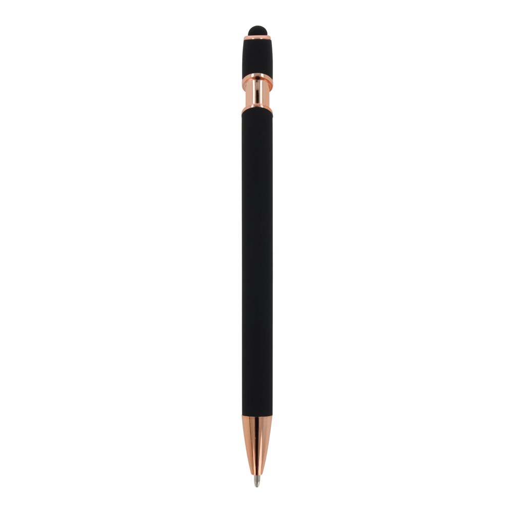 Rose Gold aluminium balpen met elegante soft-touch afwerking en stylus. Met een solide metalen clip. Schrijfkleur: blauw.