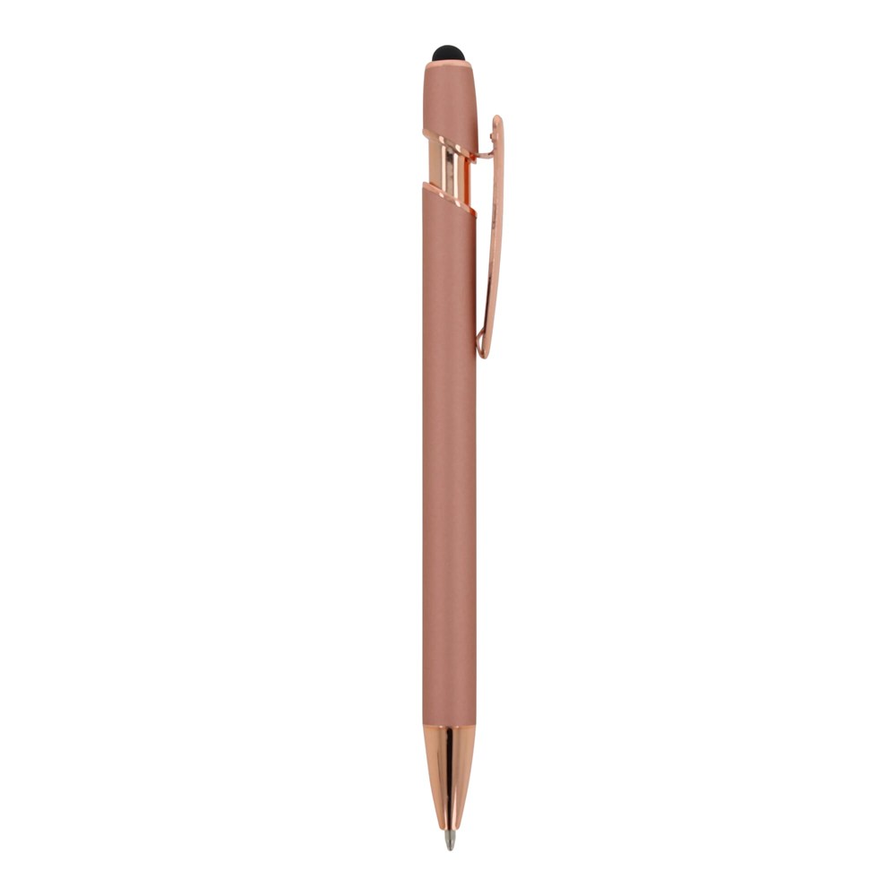 Rose Gold aluminium balpen met elegante soft-touch afwerking en stylus. Met een solide metalen clip. Schrijfkleur: blauw.