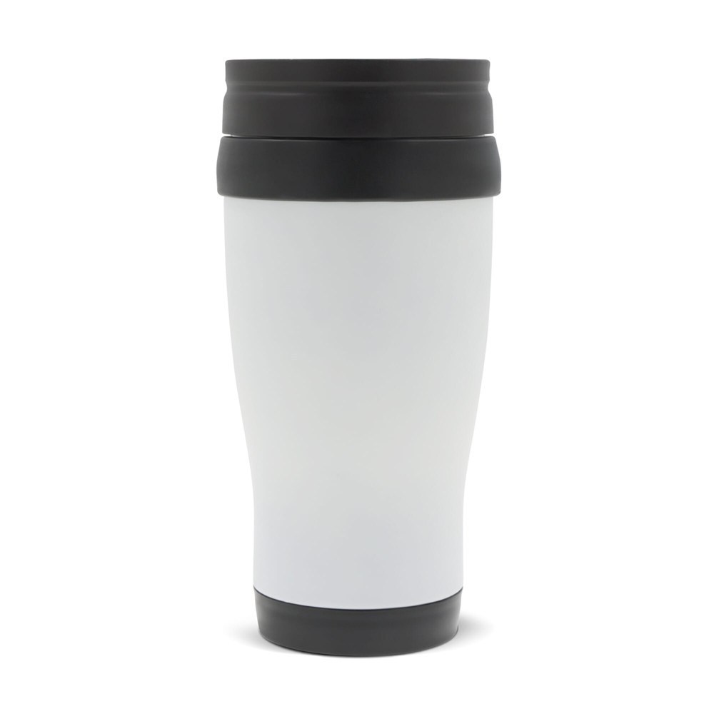 Koffiebeker geschikt voor warme dranken. Metaal van buiten en kunststof van binnen. Wordt in geschenkverpakking geleverd.