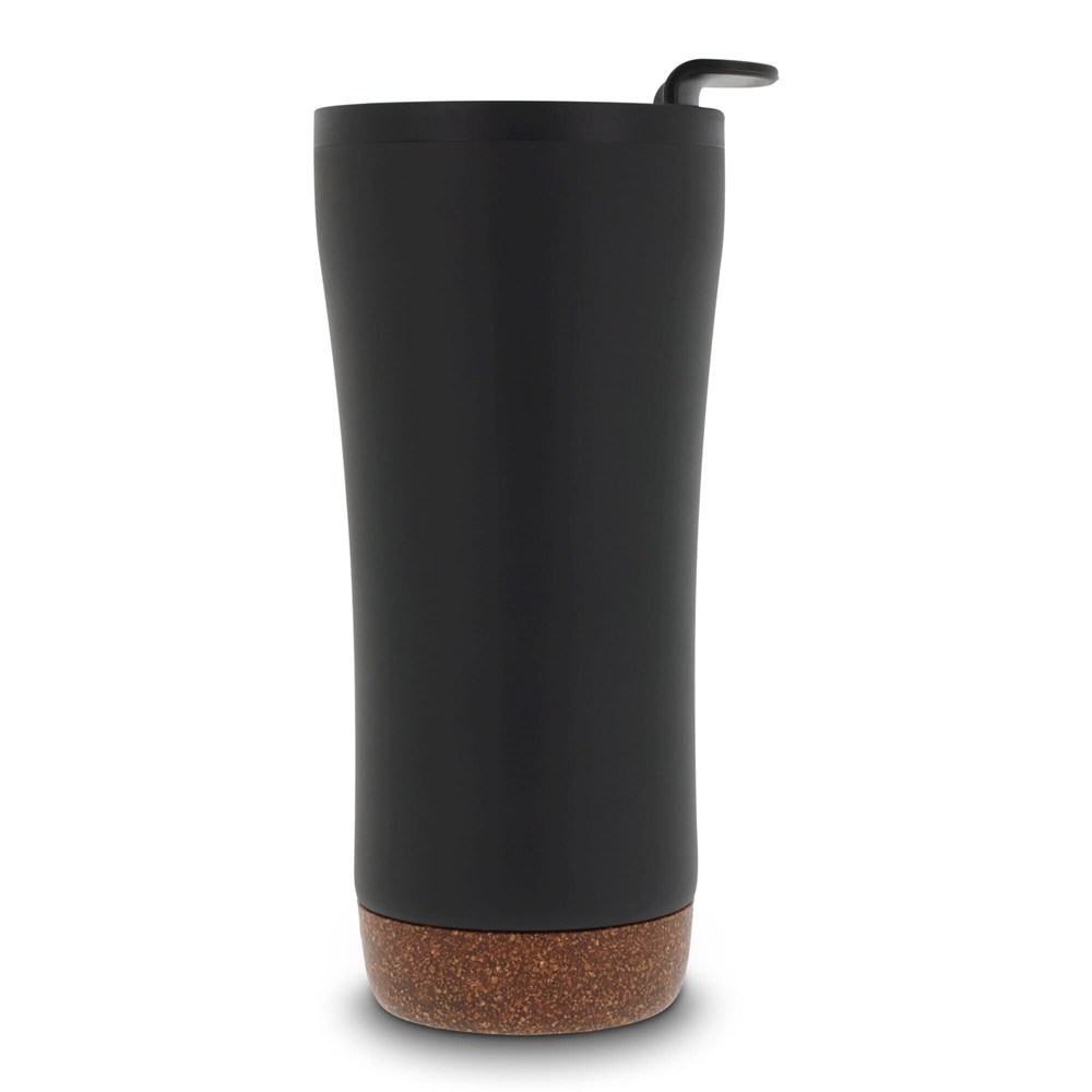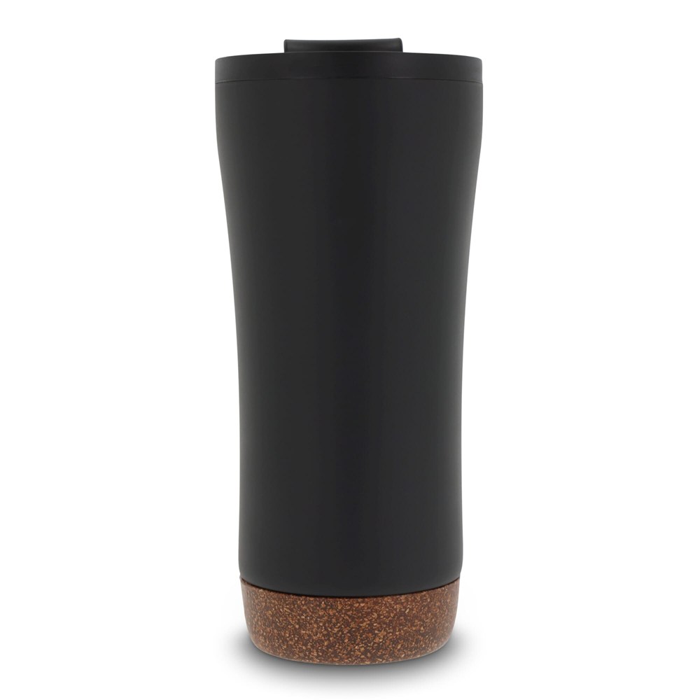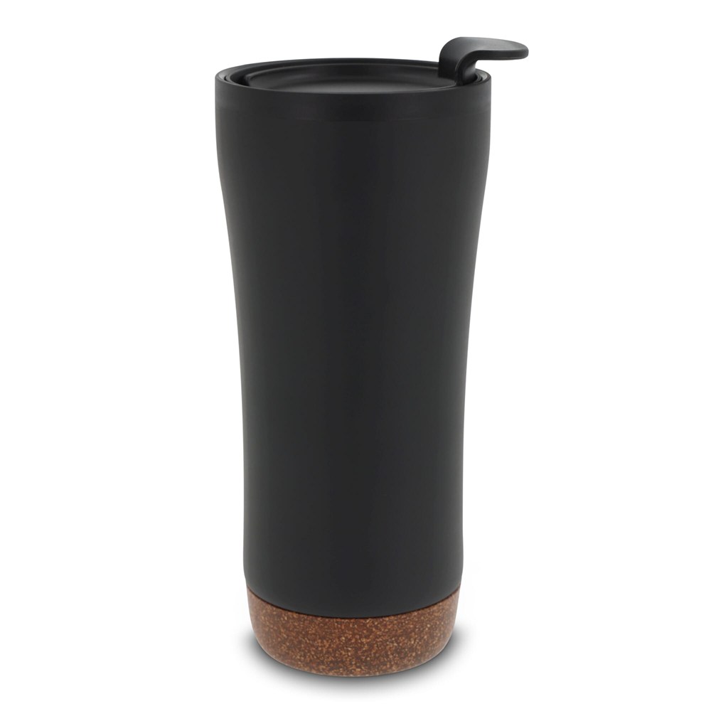 Dubbelwandige koffie beker met deksel. Roestvrijstaal aan de buitenkant en PP aan de binnenkant. Dit model houdt koffie/thee langer warm door de dubbelwandigheid en de afsluitbare deksel met drinkopening. De onderkant is gemaakt van kurk wat er voor zorgt dat de onderkant niet krast en het voorkomt koffiekringen op de tafel van koffie die langs de fles druppelt. Wordt geleverd in een geschenkverpakking.