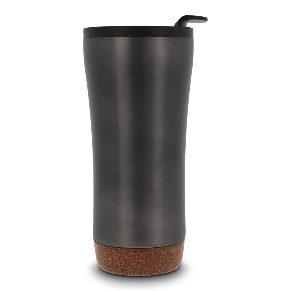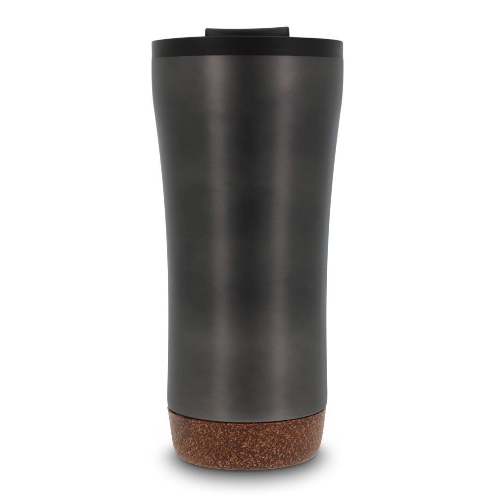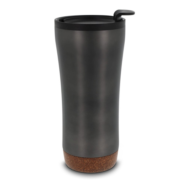 Dubbelwandige koffie beker met deksel. Roestvrijstaal aan de buitenkant en PP aan de binnenkant. Dit model houdt koffie/thee langer warm door de dubbelwandigheid en de afsluitbare deksel met drinkopening. De onderkant is gemaakt van kurk wat er voor zorgt dat de onderkant niet krast en het voorkomt koffiekringen op de tafel van koffie die langs de fles druppelt. Wordt geleverd in een geschenkverpakking.