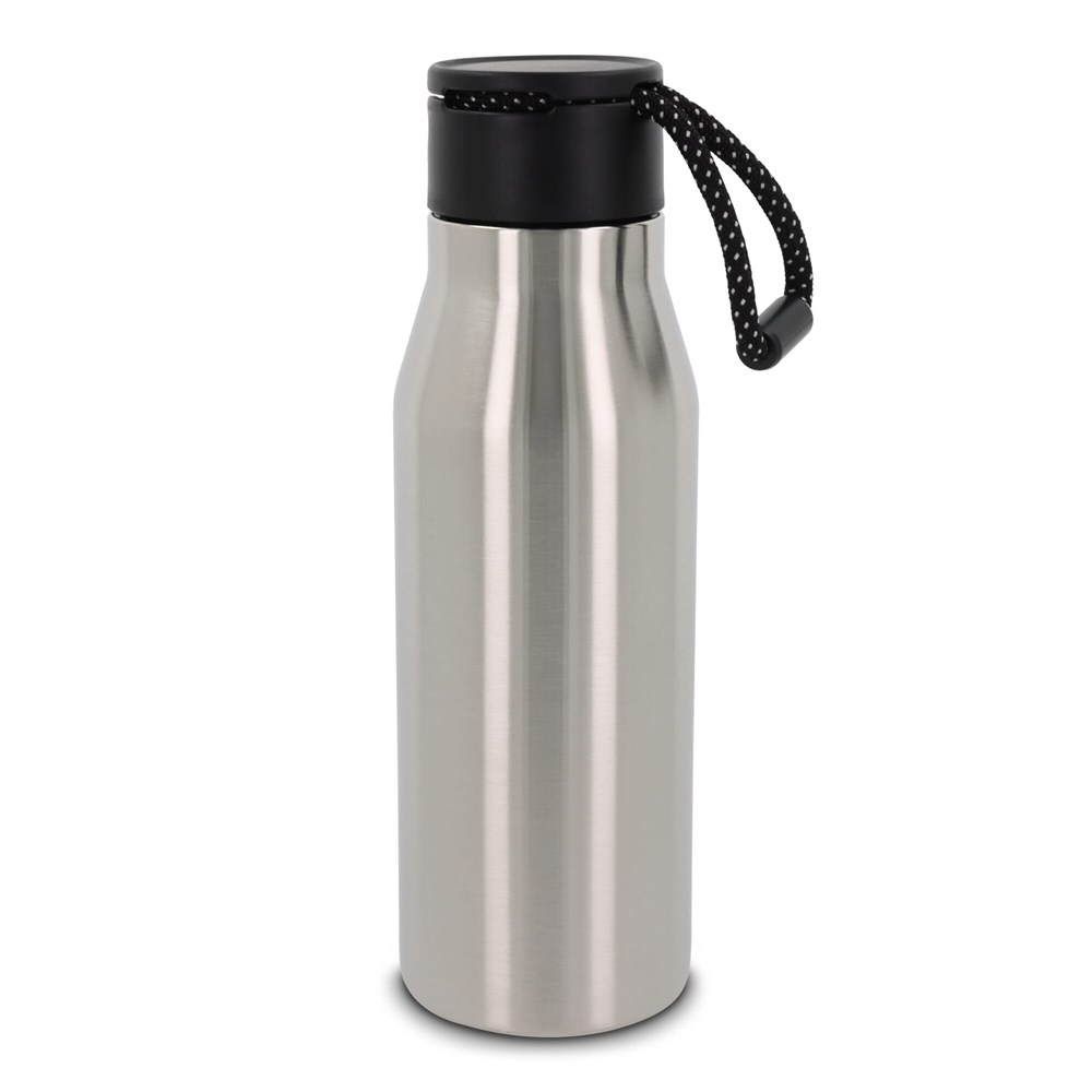 Dubbelwandige thermofles met een touw om de fles eenvoudig te dragen. De buitenkant heeft een stoer design. Wordt geleverd in een geschenkverpakking.
