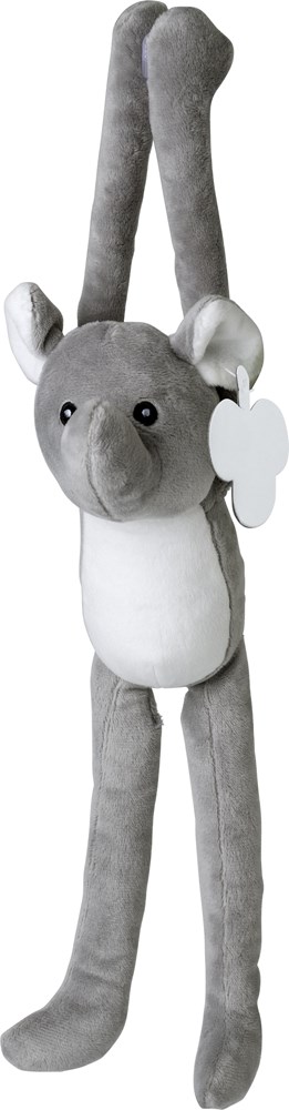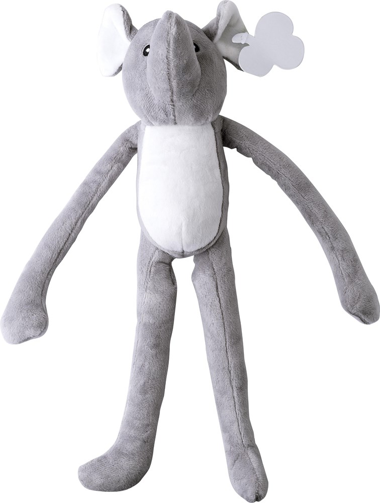 Pluche olifant met lange armen en klittenbandsluiting. Geborduurde ogen. Inclusief kartonnen label voor bedrukking.