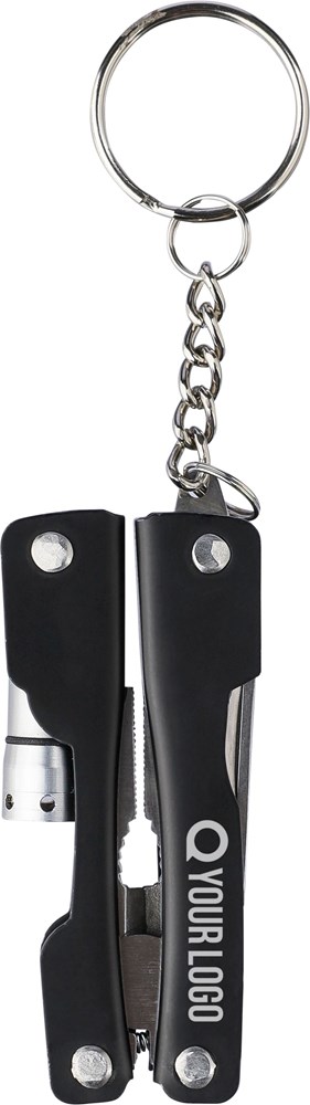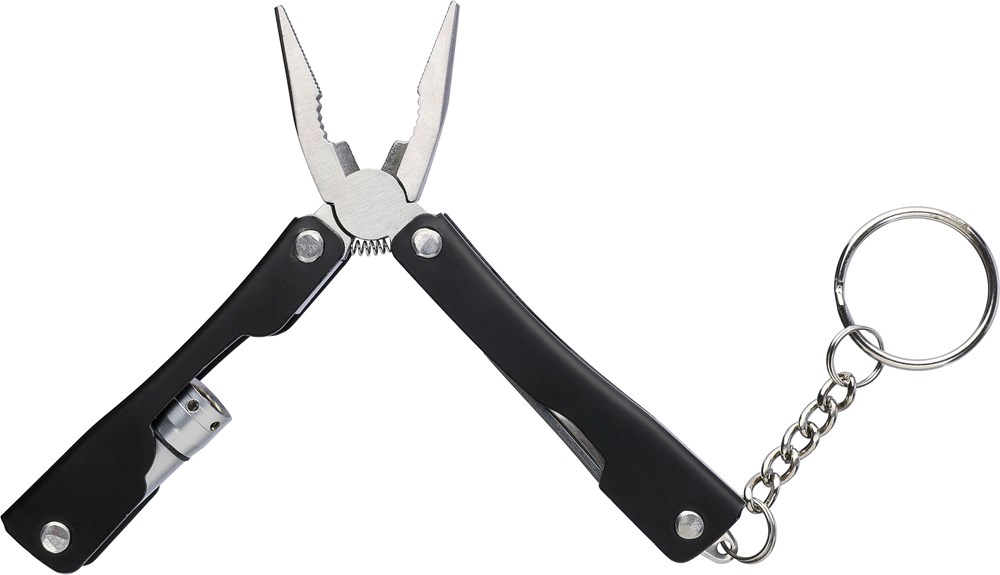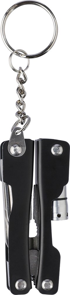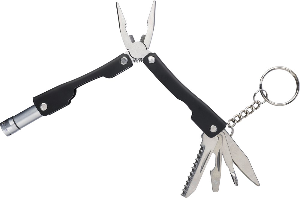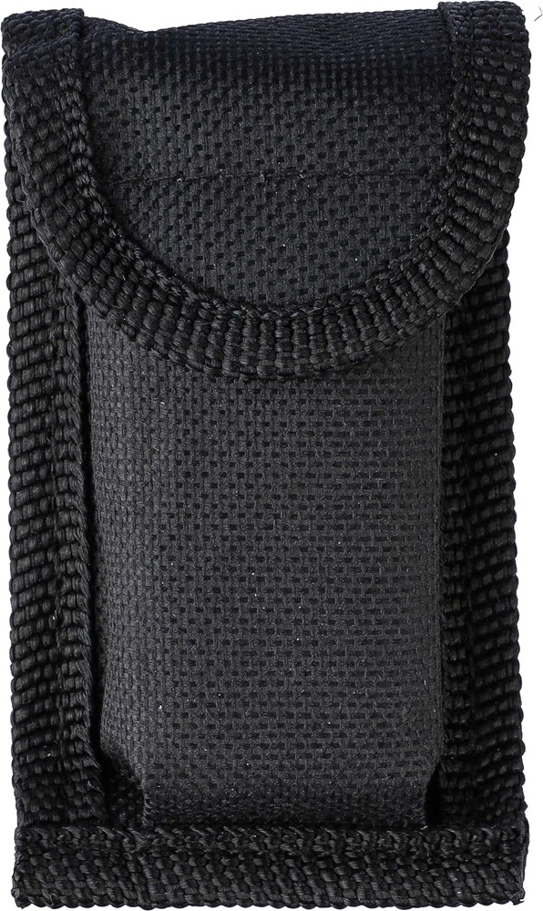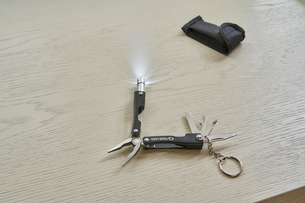 Roestvrijstalen inklapbare multitool met 10 functies. Met een enkele LED-zaklamp. Verpakt in een 600D polyester hoes met klittenbandsluiting. Hoes kan aan een riem worden bevestigd. Per stuk verpakt in een bruin kartonnen doos.