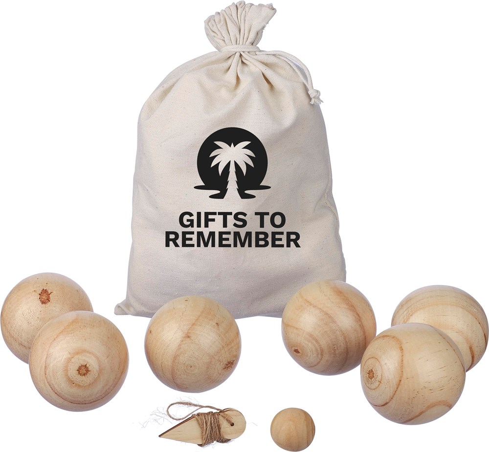 Houten balspelset, inclusief 6 ballen (7 cm per stuk) en 1 kleine bal (2 cm). Wordt geleverd met een touw en als set verpakt in een katoenen trekkoordzak. Geschikt voor 4-6 spelers en ideaal voor behendigheid activiteiten.