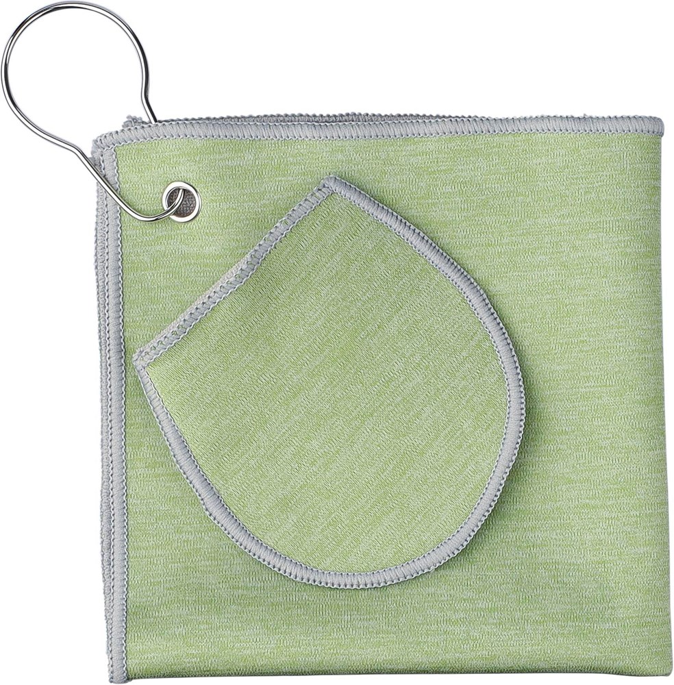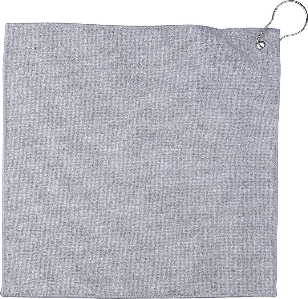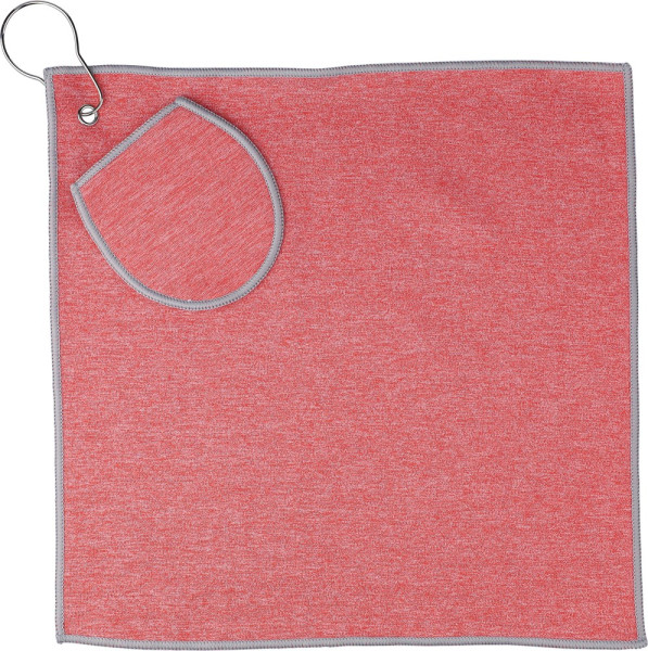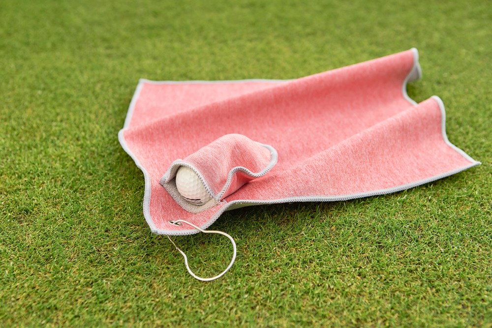 rPET golfhanddoek met een geïntegreerd golfballenvak, ongeveer 31 × 31 cm. Voorzien van een metalen haak voor eenvoudige bevestiging aan een tas en een rPET-label aan de binnenkant. Machinewasbaar (koud).