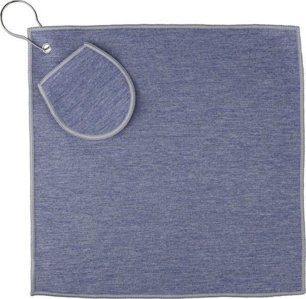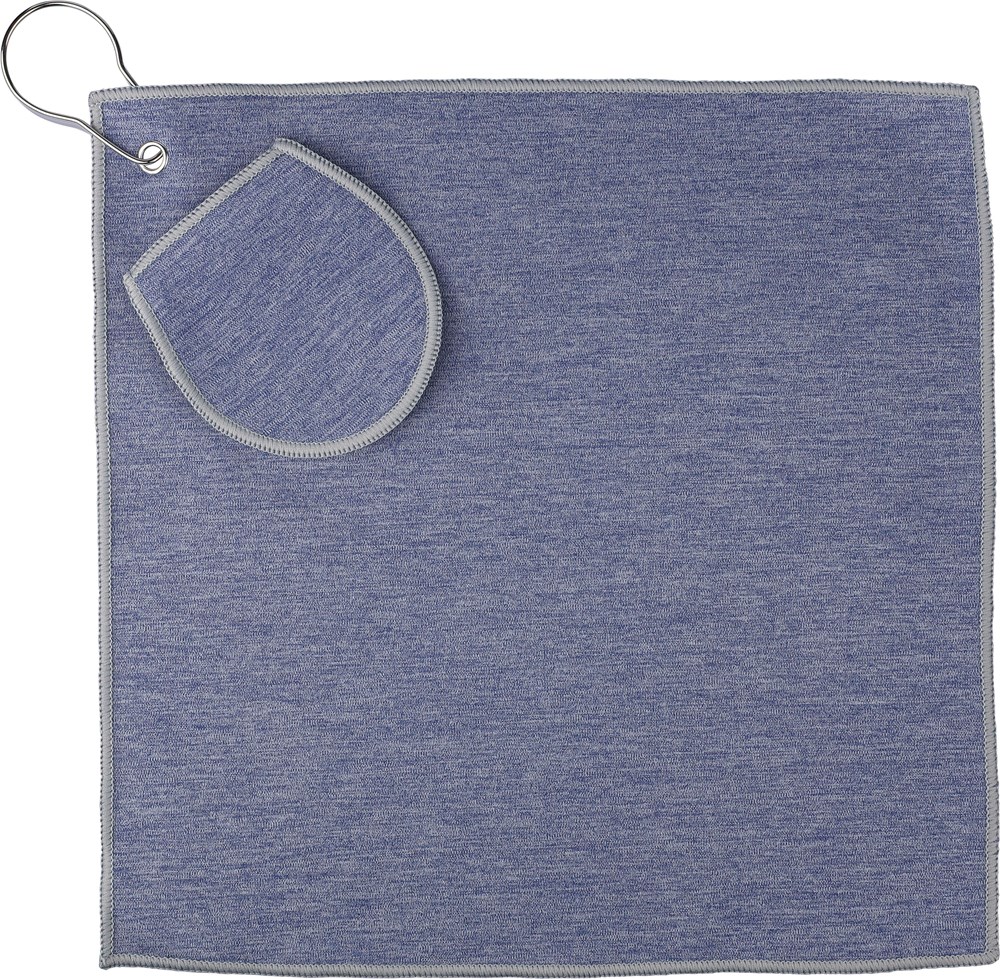 rPET golfhanddoek met een geïntegreerd golfballenvak, ongeveer 31 × 31 cm. Voorzien van een metalen haak voor eenvoudige bevestiging aan een tas en een rPET-label aan de binnenkant. Machinewasbaar (koud).
