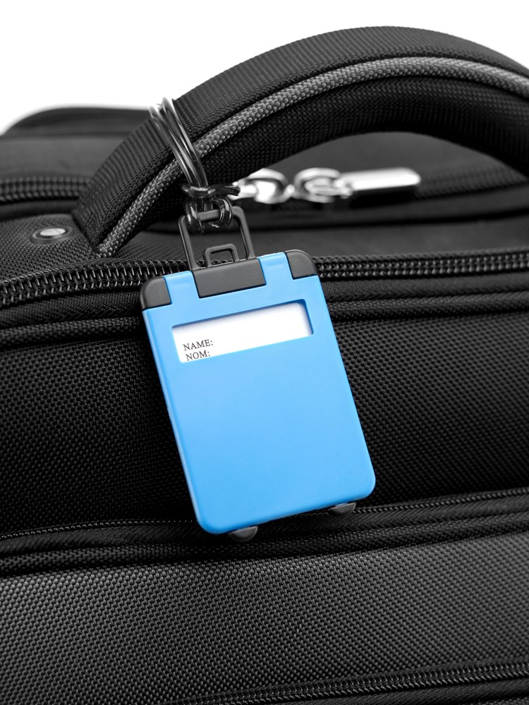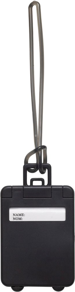 Kunststof kofferlabel met flexibel ophangkoord.