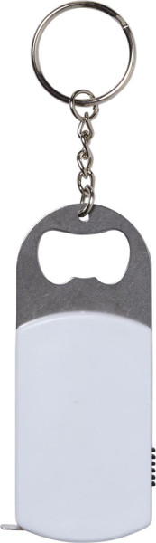 Aluminium flesopener met sleutelhanger, een wit LED lampje en een meetlint/rolmaat (1 meter), incl. batterijen.