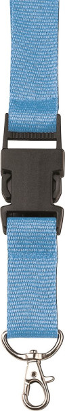 Polyester lanyard met veiligheidssluiting, kunststof gesp en karabijnhaak.