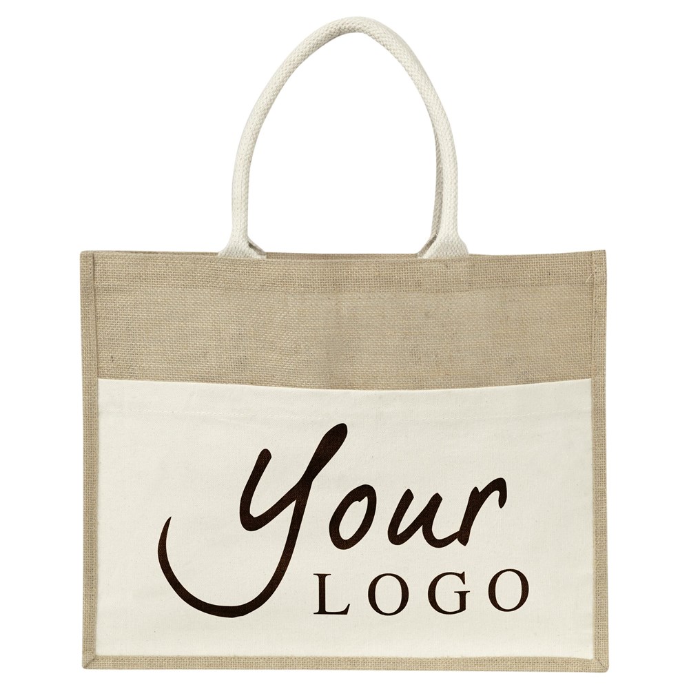 Juten tas met kunststof binnenzijde, katoenen voorvak en gevoerde hengsels.meer
