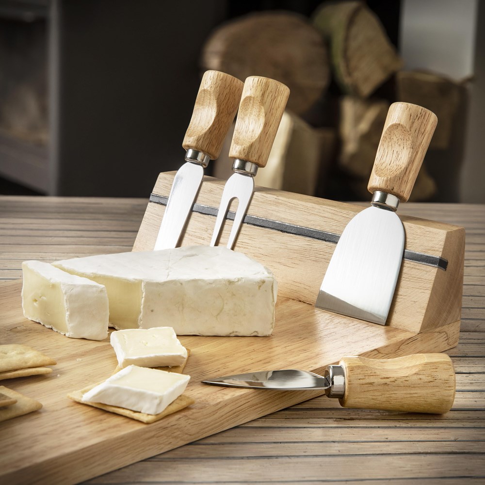 5-Delige kaasset bestaande uit een houten kaasplank met magneetstrip, 3 messen en een prikker.