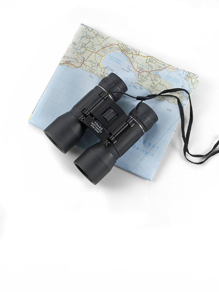 Kunststof verrekijker met rubberen elementen, met IPD schaal, verpakt in nylon etui incl. schoonmaakdoekje.