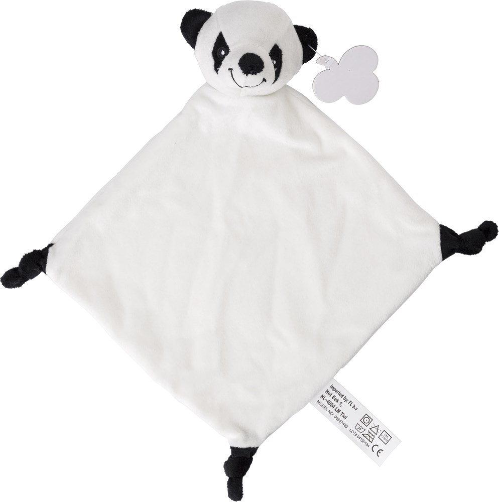 Baby 'tutdoekje' (100% polyester) met een dierenhoofd. Met kartonnen label voor bedrukking.
