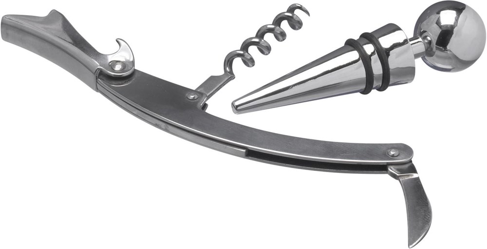 Tweedelig roestvrijstalen wijnset in een geschenkverpakking.meer