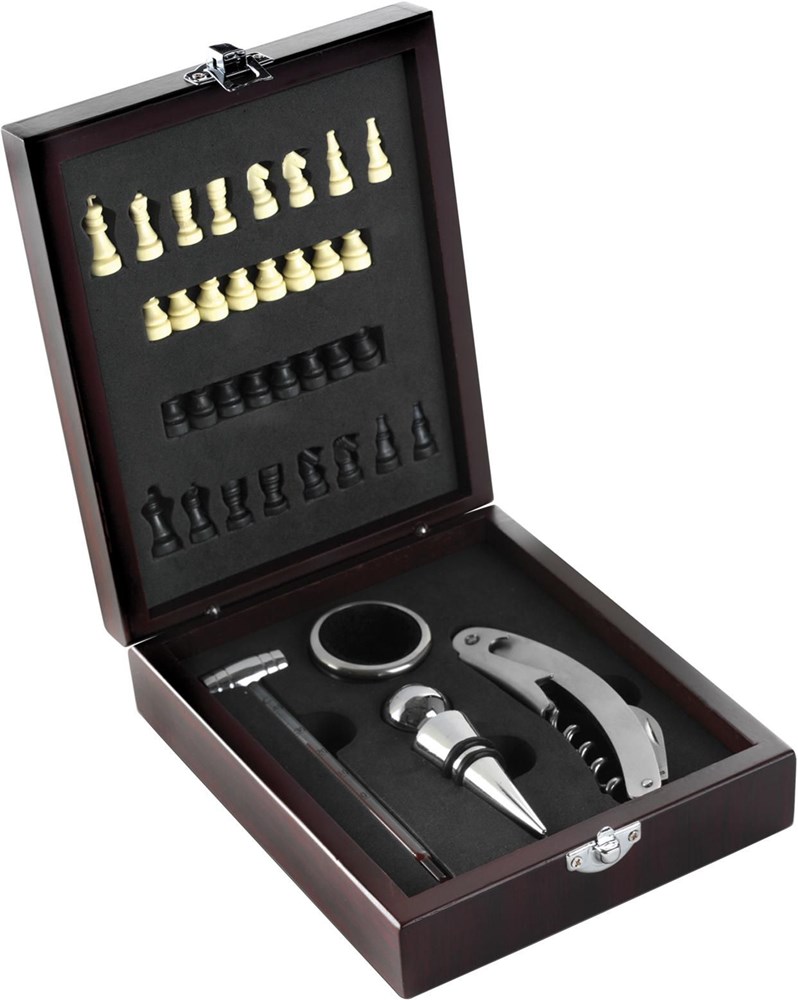 5-Delige metalen wijnset met schaakspel in een houten geschenkcassette.
