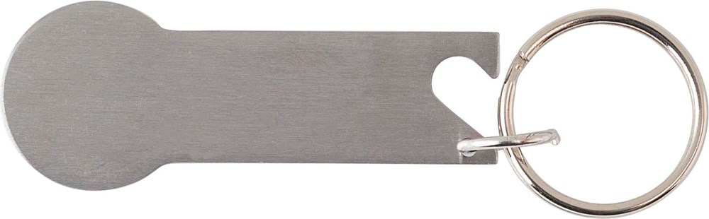 Roestvrijstalen multifunctionele sleutelhanger, met winkelwagenmunt en flesopener. Verpakt in plastic zakje.