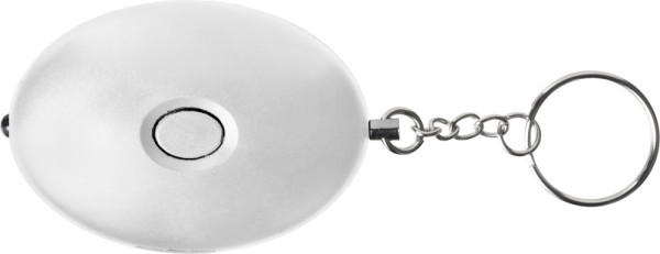 ABS persoonlijk alarm met stalen sleutelring. Het LED licht wordt geactiveerd met de drukknop. Het alarm wordt geactiveerd door de pin eruit te trekken. Inclusief batterijen.