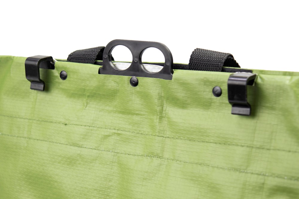 Een compacte stoere shopper tas (± 30L) die tegelijkertijd met fietshaken