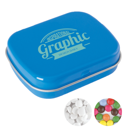 Scharnierblik 62 x 50 x 17 mm., standaard gevuld met DutchDex dextrose mints (made in Holland). Te verkrijgen in een groot scala aan kleuren.