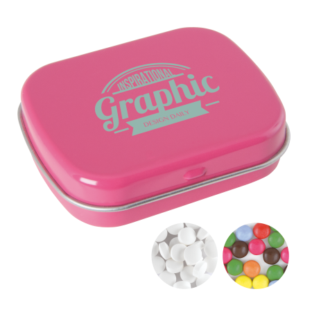 Scharnierblik 62 x 50 x 17 mm., standaard gevuld met DutchDex dextrose mints (made in Holland). Te verkrijgen in een groot scala aan kleuren.