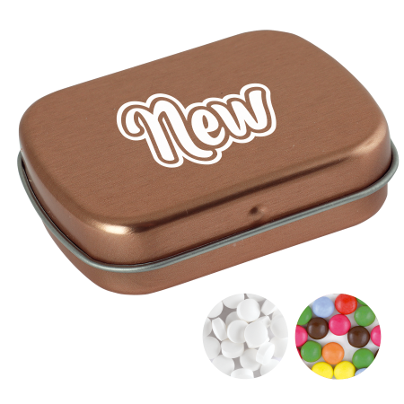 Scharnierblik 62 x 50 x 17 mm., standaard gevuld met DutchDex dextrose mints (made in Holland). Te verkrijgen in een groot scala aan kleuren. Optioneel keuze uit diverse vullingen: extra sterke `triangle` mintjes, suikerhartjes, minthartjes, chococarletties, chocoparels goud, goudglimmers melkchocolade, roseglimmers melkchocolade, zilverglimmers melkchocolade, mini chocoparels goud of koper, vruchtenhartjes (made in Holland), jelly beans (made in Holland), kleine hartjes goud of rood/wit, zomerconfetti choco puur, marmergoud choco puur