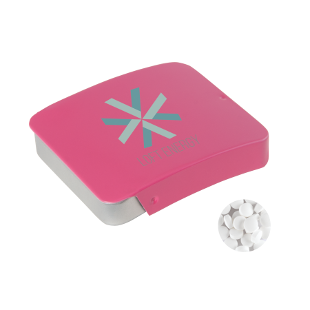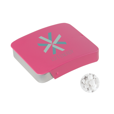 Schuifblikje metaal, 54 x 45 x 11 mm., met ca. 10 gr. extra sterke `triangle` mintjes, verkrijgbaar in een groot aantal kleuren.