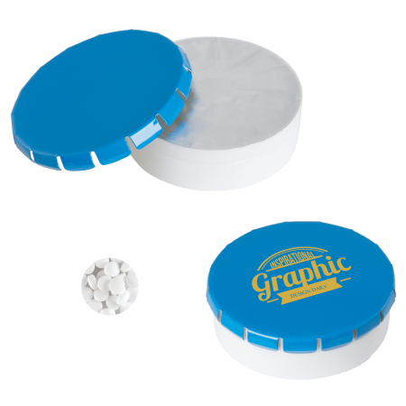 Super Click Clack Ø 45 mm x 15 mm., met ca. 12 gr. suikervrije mintjes. witte bodem van gerecycled PP met seal en metalen deksel, beschikbaar in een groot scala aan kleuren.