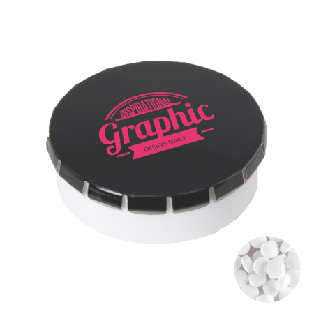 Super Click Clack Ø 45 mm x 15 mm., met ca. 12 gr. suikervrije mintjes. witte bodem van gerecycled PP met seal en metalen deksel, beschikbaar in een groot scala aan kleuren.
