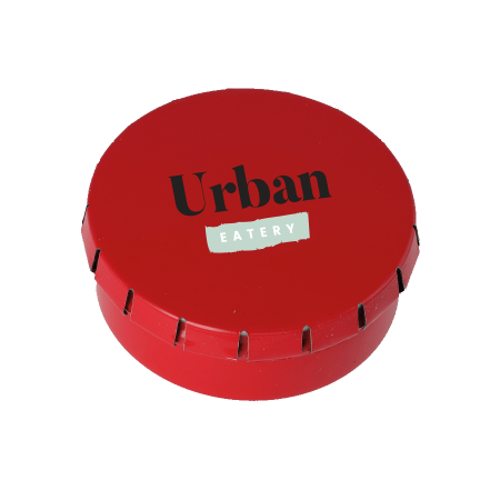 Rond click clack blik Ø 53 mm x 18 mm., standaard gevuld met DutchDex dextrose mints (made in Holland).