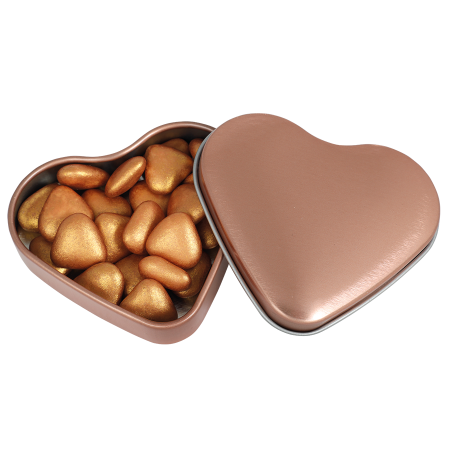 Hart blik 70 x 65 x 15 mm., verkrijgbaar in 4 kleuren. Standaard gevuld met vruchtenhartjes (made in Holland).