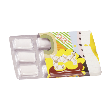 Kauwgom met Xylitol blister 6 stuks, 65 x 60 x 8 mm, in een bedrukte kartonnen huls tot full colour