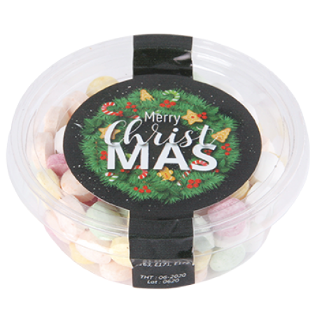 Transparant Biodegradable bakje met los deksel Ø 70 x 26 mm. gevuld met 40 gr. mintjes, fruit bolletjes of fruit hartjes