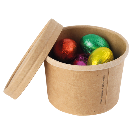 Snoeppot van natuurlijk ongebleekt kraft karton met deksel 240 ml, keuze uit diverse vullingen:...meer
