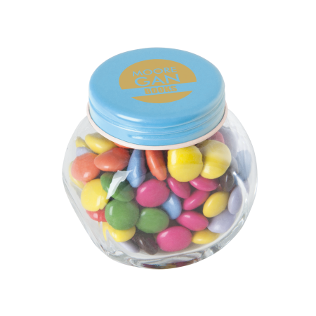 Kleine glazen pot gevuld met ca. 40 gr. choco carletties gekleurd deksel, 53 x 35 x 55 mm., met bedrukking op deksel