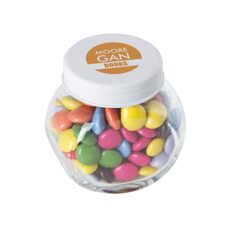 Kleine glazen pot gevuld met ca. 40 gr. choco carletties gekleurd deksel, 53 x 35 x 55 mm., met bedrukking op deksel