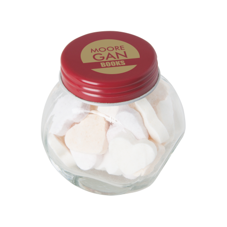 Kleine glazen pot gevuld met ca. 40 gr. vruchten hartjes gekleurd deksel, 53 x 35 x 55 mm., met bedrukking op het dekseltje