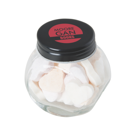 Kleine glazen pot gevuld met ca. 40 gr. vruchten hartjes gekleurd deksel, 53 x 35 x 55 mm., met bedrukking op het dekseltje