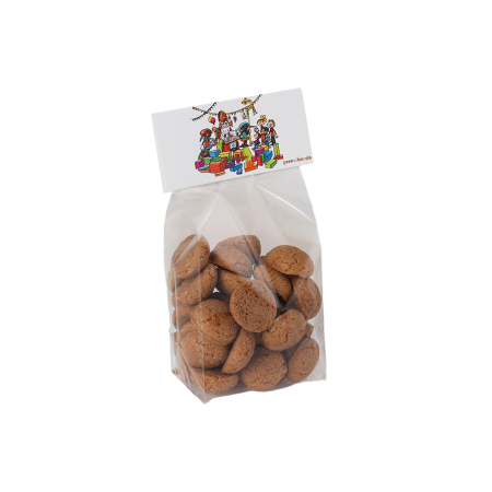 PP Blokbodemzakje 22 x 20 x 200 mm., met tot in full colour bedrukt kopkaartje, keuze uit diverse vullingen: DutchDex dextrose mintjes, extra sterke `triangle` mintjes, vruchten hartjes, fruitbolletjes, fruithartjes, minthartjes, pepermunt, suikerhartjes, tum tum, chocoparels goud, crispy chocolade festival, crispy chocolade juwelen, goudglimmers melkchocolade, kleine hartjes goud, kleine hartjes rood/wit, marmergoud choco puur, micro eitjes melkchoco, mini chocoparels goud, mini chocoparels koper, roseglimmers melkchocolade, zilverglimmers melkchocolade, zomerconfetti choco puur of praliné kievitseitjes.