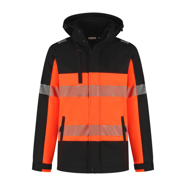 Fluorescerend veiligheids-softshell jacket, conform de Europese norm EN 17353:2020 - AB3, 100% gerecycled polyester (GRS gecertificeerd), 300 gr/m2, unisex, modern fit, 3-laags softshell met microfleece als binnenlaag, afneembare capuchon doormiddel van drukknopen, winddicht, waterafstotend en ademend. Volledige 2-way YKK rits met puller, 2 steekzakken en borstzak met YKK rits en puller. Gevoerde mouwen met verstelbare manchetten en windstoppers. Reflecterende gesegmenteerde LOXY-tape op de schouders, mouwen en rondom het lichaam.